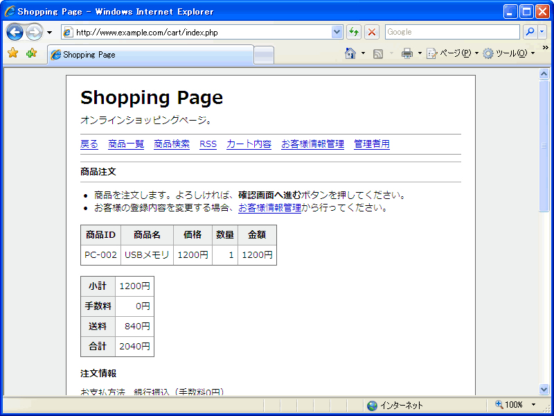 商品の購入手続きを行い、注文メールを管理者に送信します。主な機能は以下のとおりです。