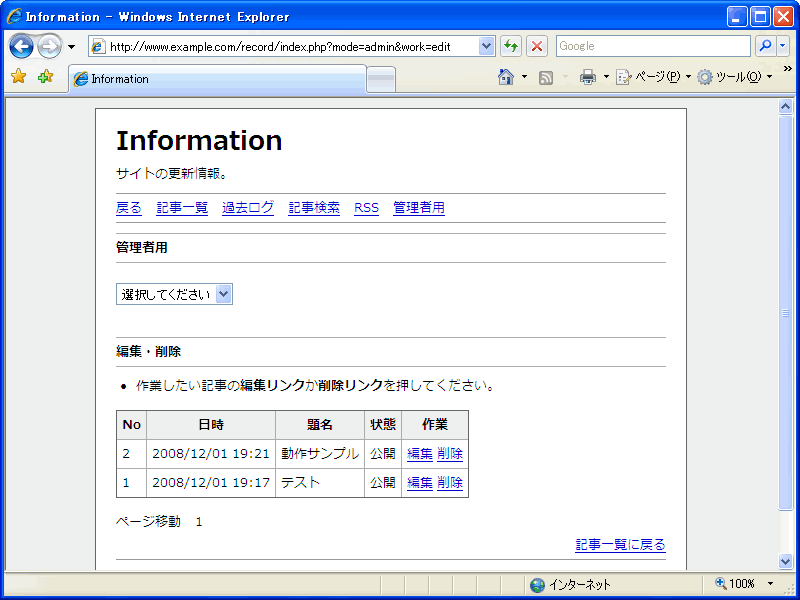 ブラウザから更新情報を管理することができます。主な機能は以下のとおりです。