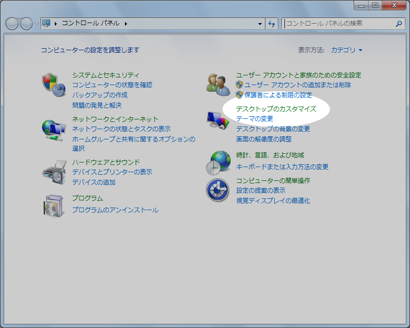 以下はWindows7とWindowsVistaで拡張子を表示させる方法です。Windowsのスタートメニューから『コントロールパネル』を選択すると以下の画面が開くので、ここから『デスクトップのカスタマイズ』を選択します。(クリックすると拡大表示されます。)