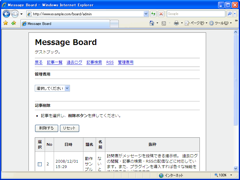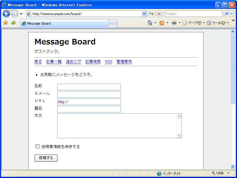 訪問者がメッセージを投稿できる掲示板。主な機能は以下のとおりです。